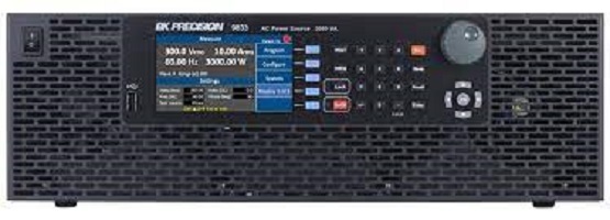 he BK Precision 9833 Programmable AC Power Source, 300V/30A, 3000 VA, 190-250 VAC Line Input is a single-phase AC power source with an AC power of 2000 VA and an operating frequency range of 45-500 Hz. The low harmonic distortion meets the IEC 61000-3-2 standard, making this model ideal for pre-compliance testing. A variety of power line disturbances can be simulated using pulse, step, and list modes. Users can select from 30 built-in THD waveforms or generate user-defined harmonic waveforms with the included PC software. The instrument’s capability can be extended further, by connecting an arbitrary waveform generator to the analog input.
